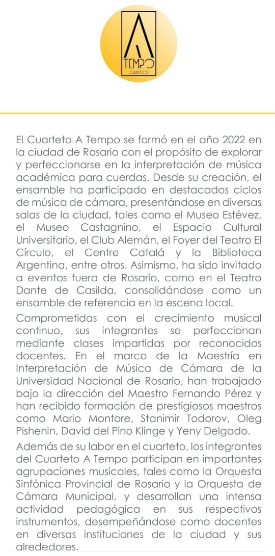 En la Sede de la Dante Alighieri de Rosario se realizará un concierto especial a cargo del cuarteto de cuerdas A TEMPO y el oboísta Ulises Oreste. El evento será el viernes 26 de septiembre a las 19:00 hs y estará abierto a toda la comunidad.