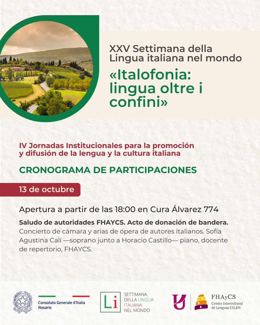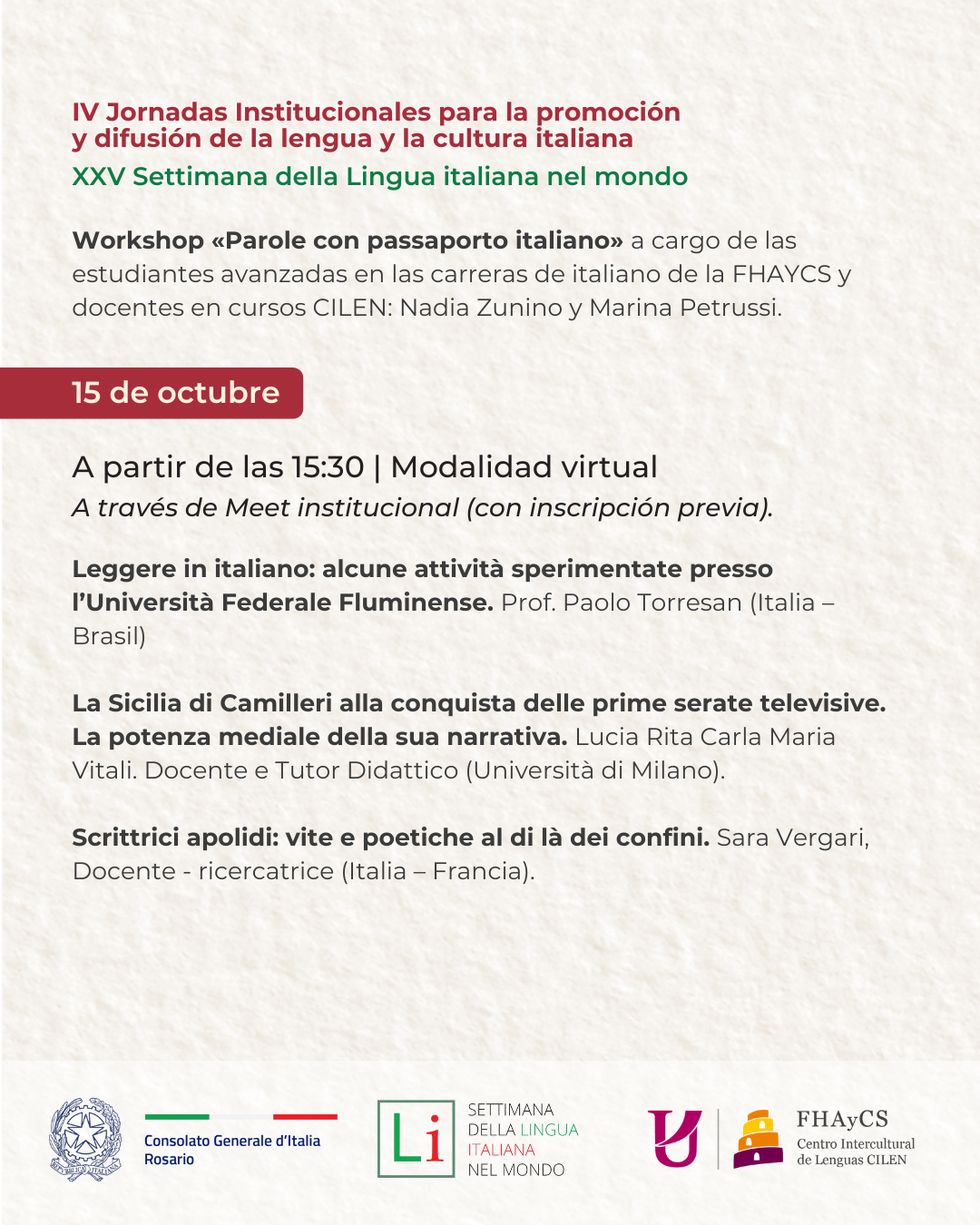 Se hacen públicos los encuentros lingüísticos y culturales relativos a la Semana de la Lengua Italiana en el Mundo. Estos se enmarcan en las V Jornadas Institucionales para la promoción y difusión de la lengua y la cultura italianas, organizadas por la Facultad de Humanidades, Artes y Ciencias Sociales de la UADER, en colaboración con el Consulado General de Italia en Rosario.