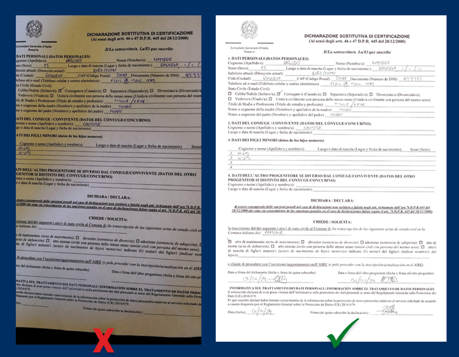 Las traducciones al italiano deben ser siempre completas, no se aceptarán modelos bilingües emitidos por la Oficina del “Registro Civil” argentino.