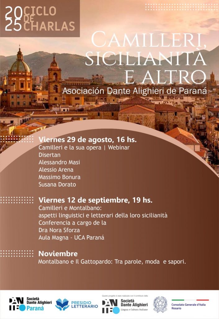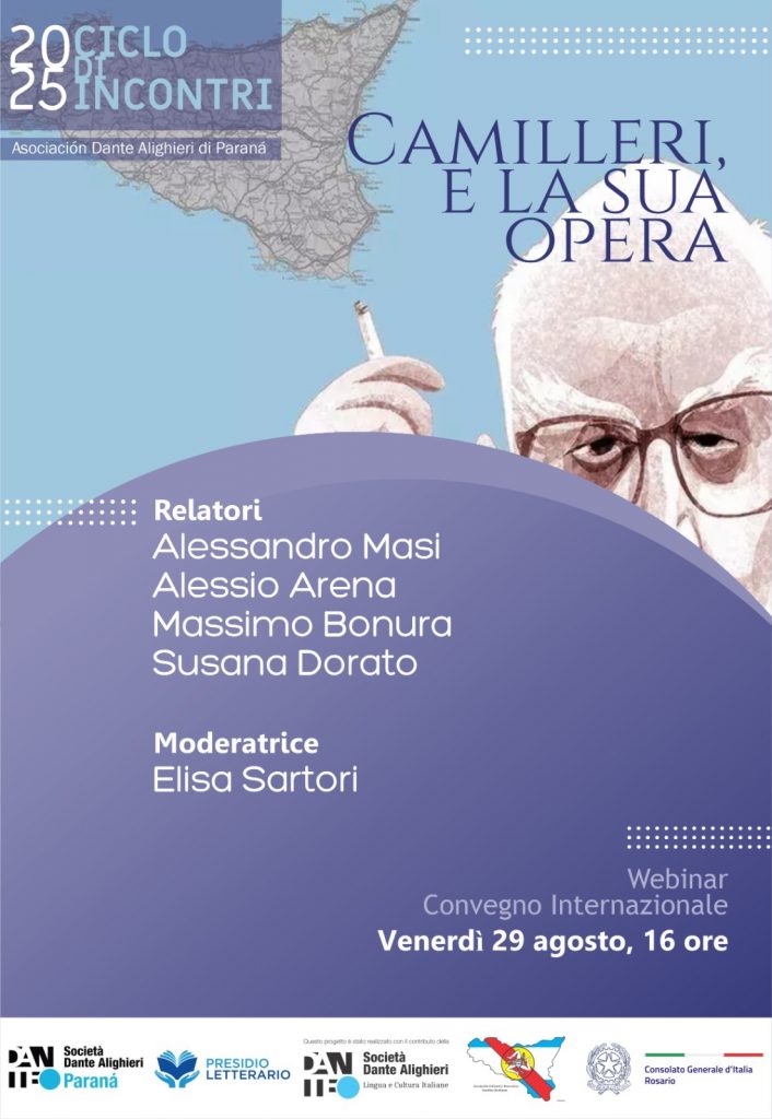 In occasione del centenario della sua nascita presentiamo un ciclo di incontri che prenderà il via venerdì 29 agosto con il webinar-convegno internazionale “Camilleri, e la sua opera”, promosso dal Comitato della Società Dante Alighieri, che è anche Presidio Letterario, e dalla Asociación Cultural y Recreativa Familias Sicilianas de Paraná, con il sostegno del Consolato Generale d’Italia a Rosario.